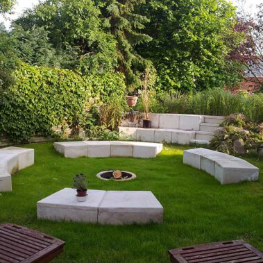 Das Amphitheater aus gegossenem weißen Beton, ist von uns gefertigt und aufgestellt.